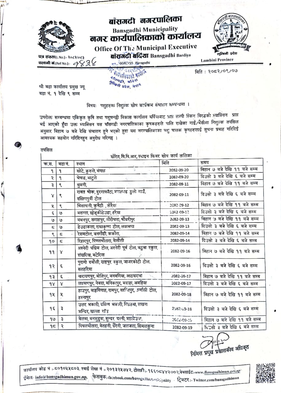 निः शुल्क पशु खोप कार्यक्रम सञ्चालन हुने सम्बन्धी सूचना ।