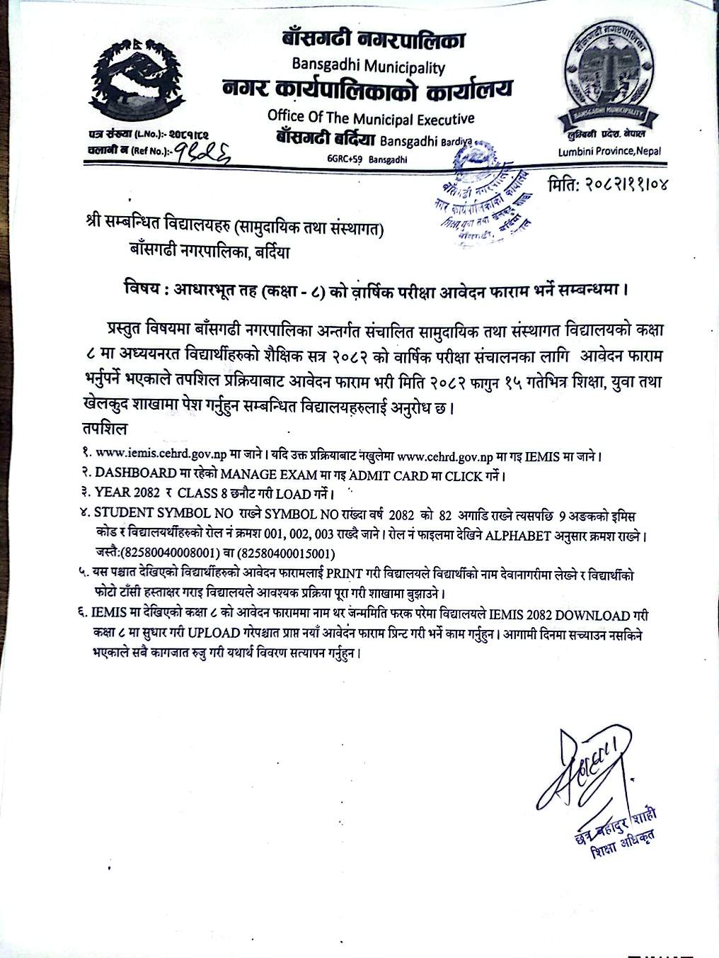आधारभुत तह (कक्षा १ -८) को वार्षिक परिक्षा आवेदन फारम भर्ने सम्वन्धि सुचना ।