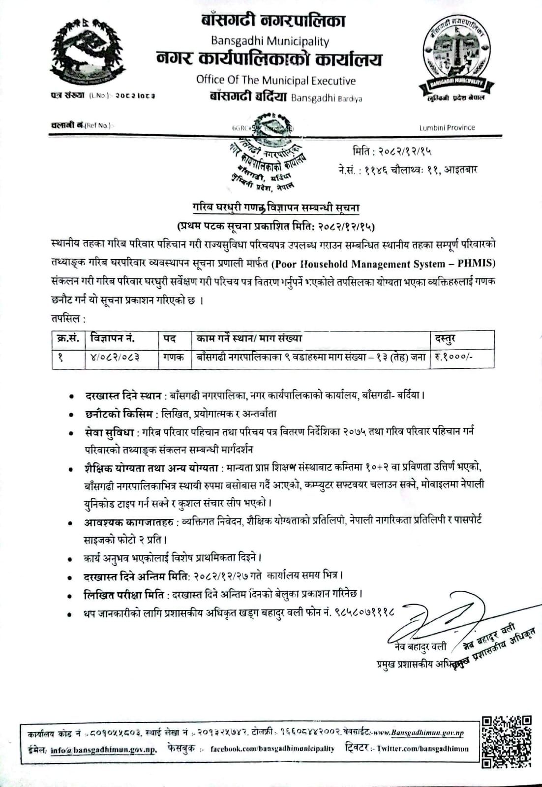 Home » गरिव परिवार सर्वेक्षणका लागी गणक पदको विज्ञापन गरिएको सूचना ।