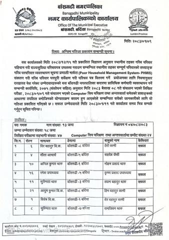 Home » गरीव घरधुरी सर्वेक्षक गणक पदको अन्तिम नतिजा प्रकाशन गरिएको सूचना ।