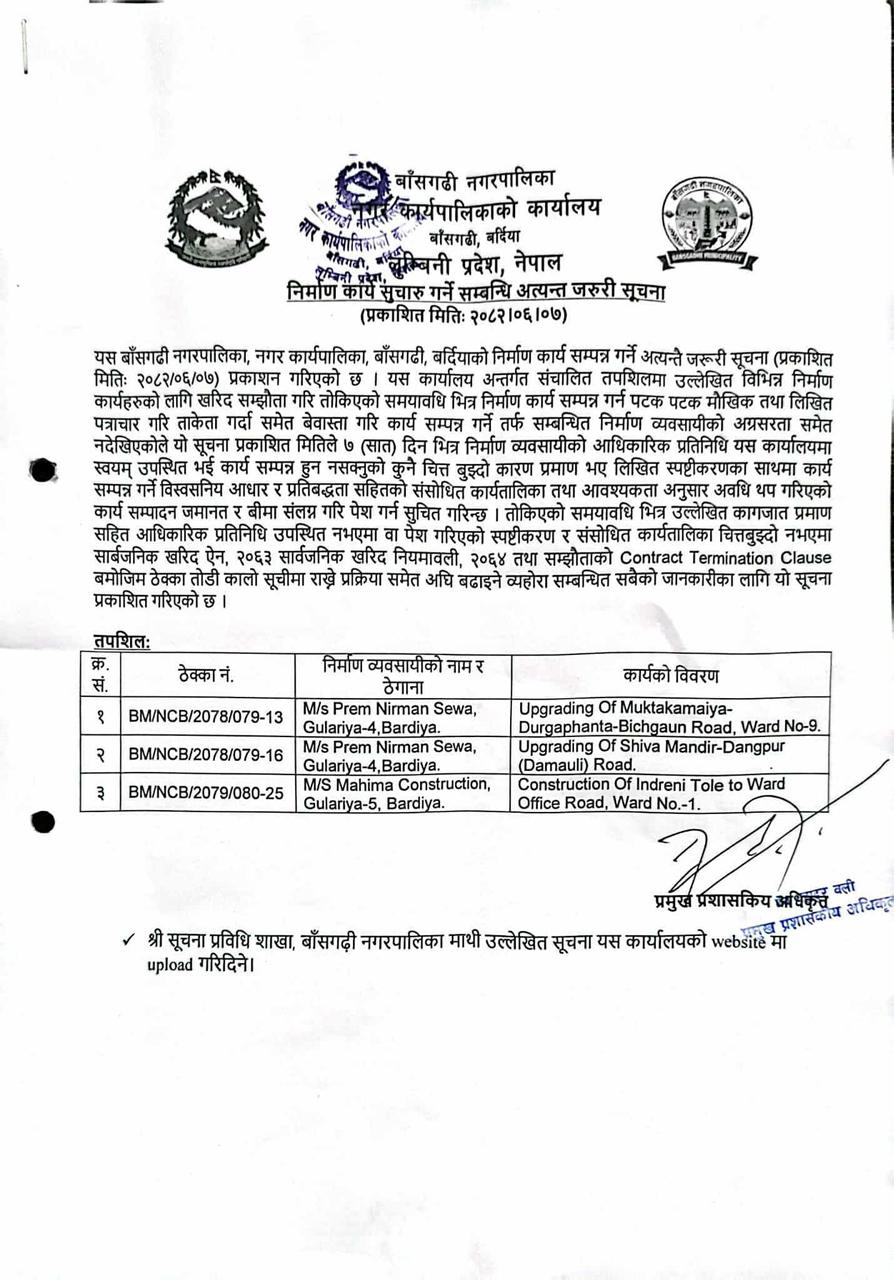 निर्माण कार्य सूचारु गर्ने सम्बन्धी अत्यन्त जरुरी सूचना ।