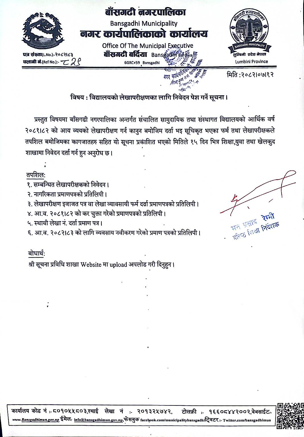 विद्यालयको लेखापरिक्षणका लागी निवेदन पेश गर्ने सम्बन्धी सूचना ।