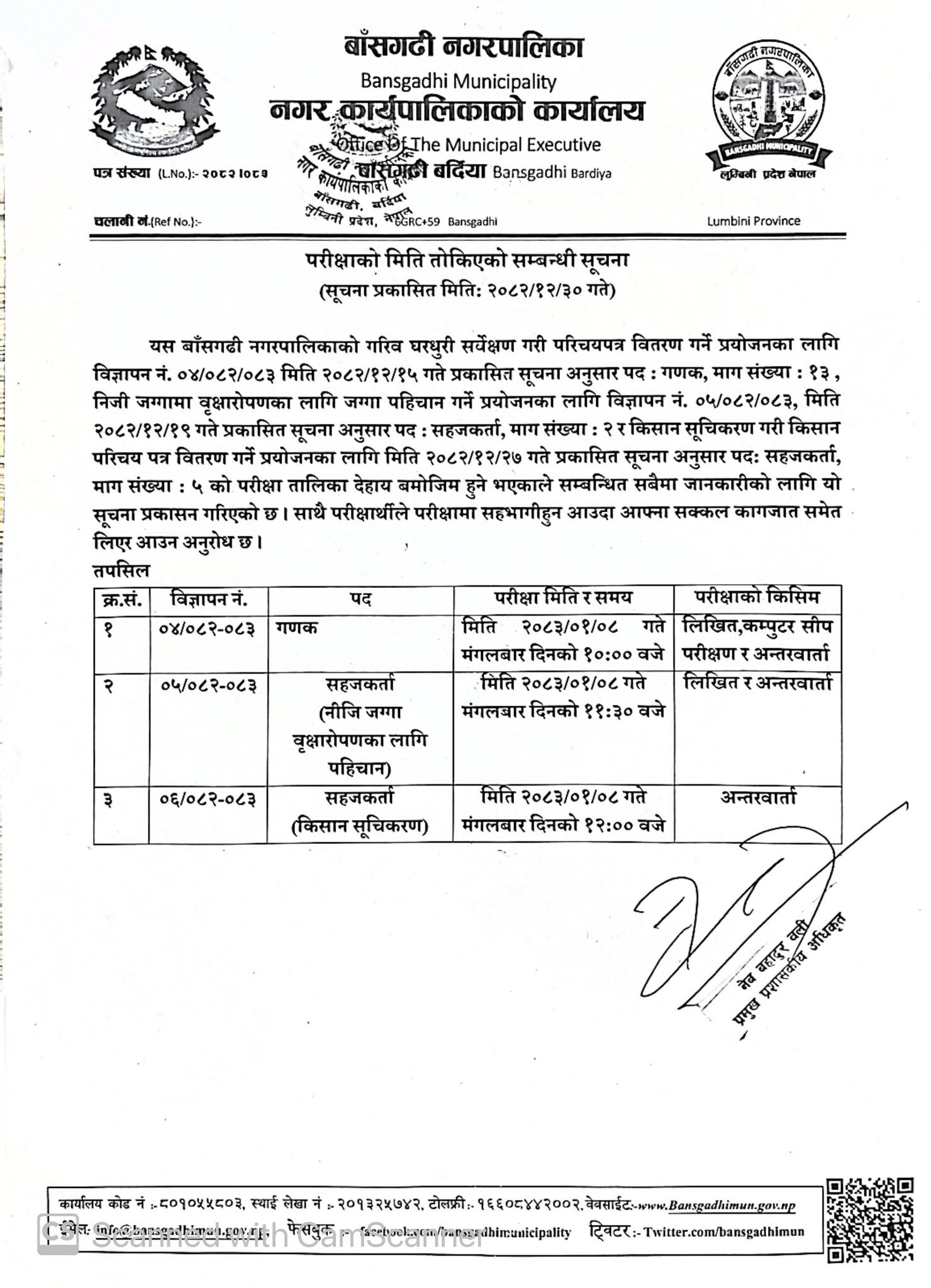 विभिन्न मितिमा खोलिएका सेवा करारका विभिन्न पदहरुको परिक्षा मिति तोकिएको सम्बन्धमा ।